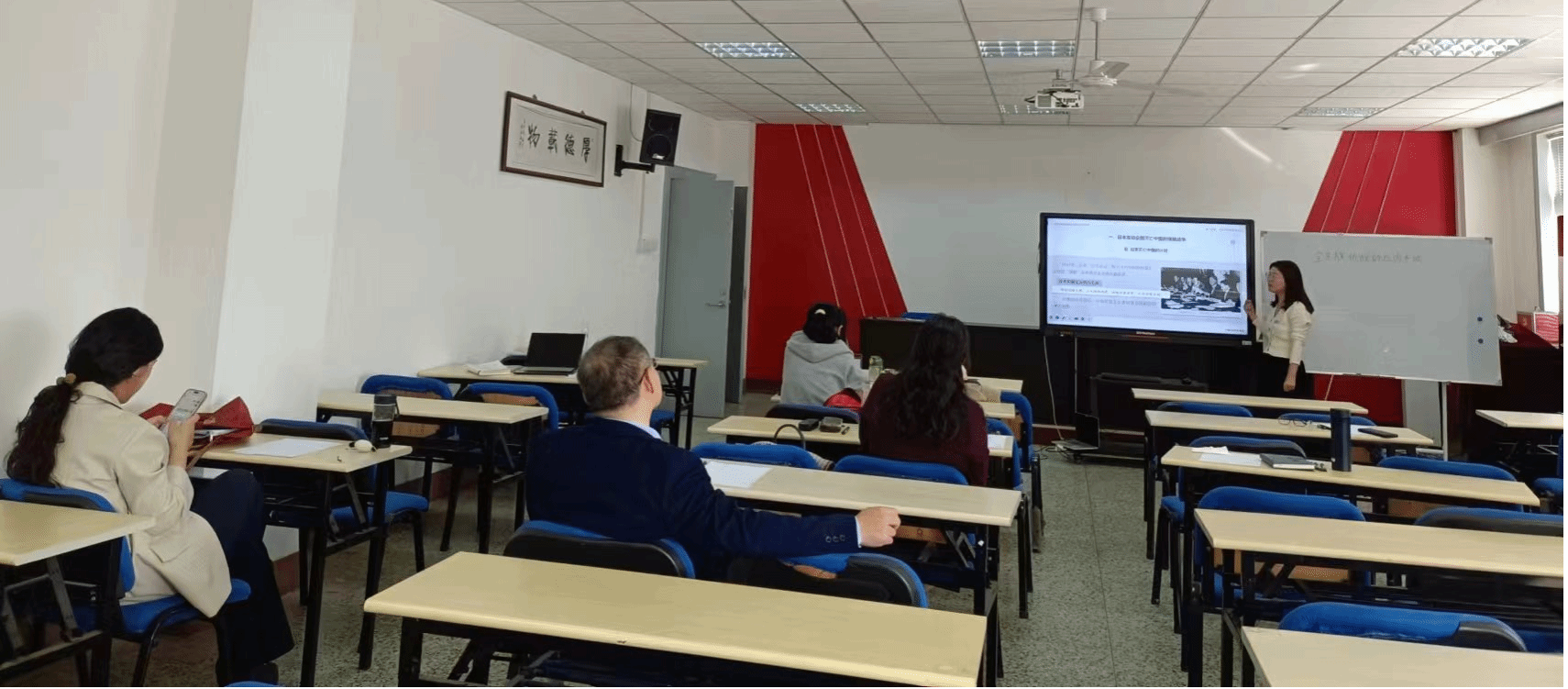 首先,四位青年教师分别从《思想道德与法治》《习近平新时代中国特色社会主义思想概论》《中国近现代史纲要》课程中选取相关内容进行教学展示。其中谭桂照和薛冬冬老师就“人的本质”进行讲解,两位老师从不同的角度对这一问题进行细致分析,谭老师导入角度新颖,薛老师语言生动幽默;肖楠楠老师就“全民族抗战的形成”进行展示,史料翔实;张弛老师以“中国式现代化”为选题,内容丰富。