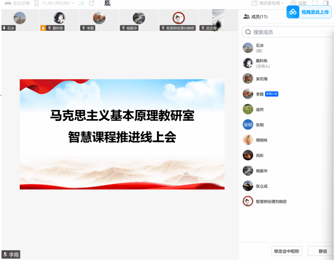 智慧树公司王美贤为老师们汇报了近期工作日程和进度。在交流研讨环节,围绕智慧课程建设细节展开深入磋商。针对章节安排,老师们结合马原课程“唯物论—辩证法—认识论—唯物史观—政治经济学—科学社会主义”的逻辑主线,提出“核心原理模块化拆分、重难点专题化设计”的优化思路。关于视频录制,大家聚焦重难点内容,明确了“理论讲解、案例解析、问题引导”的录制模式,同步确定各章节视频录制的分工及完成时限。 最后,对近期智慧课程建设工作进行细化部署,明确了各专项任务的负责人及进度核查节点。此次推进会的召开,进一步明晰了智慧课程建设的路径方向,凝聚了全员育人的共识力量,为后续课程质量提升及教学改革深化奠定了坚实基础。