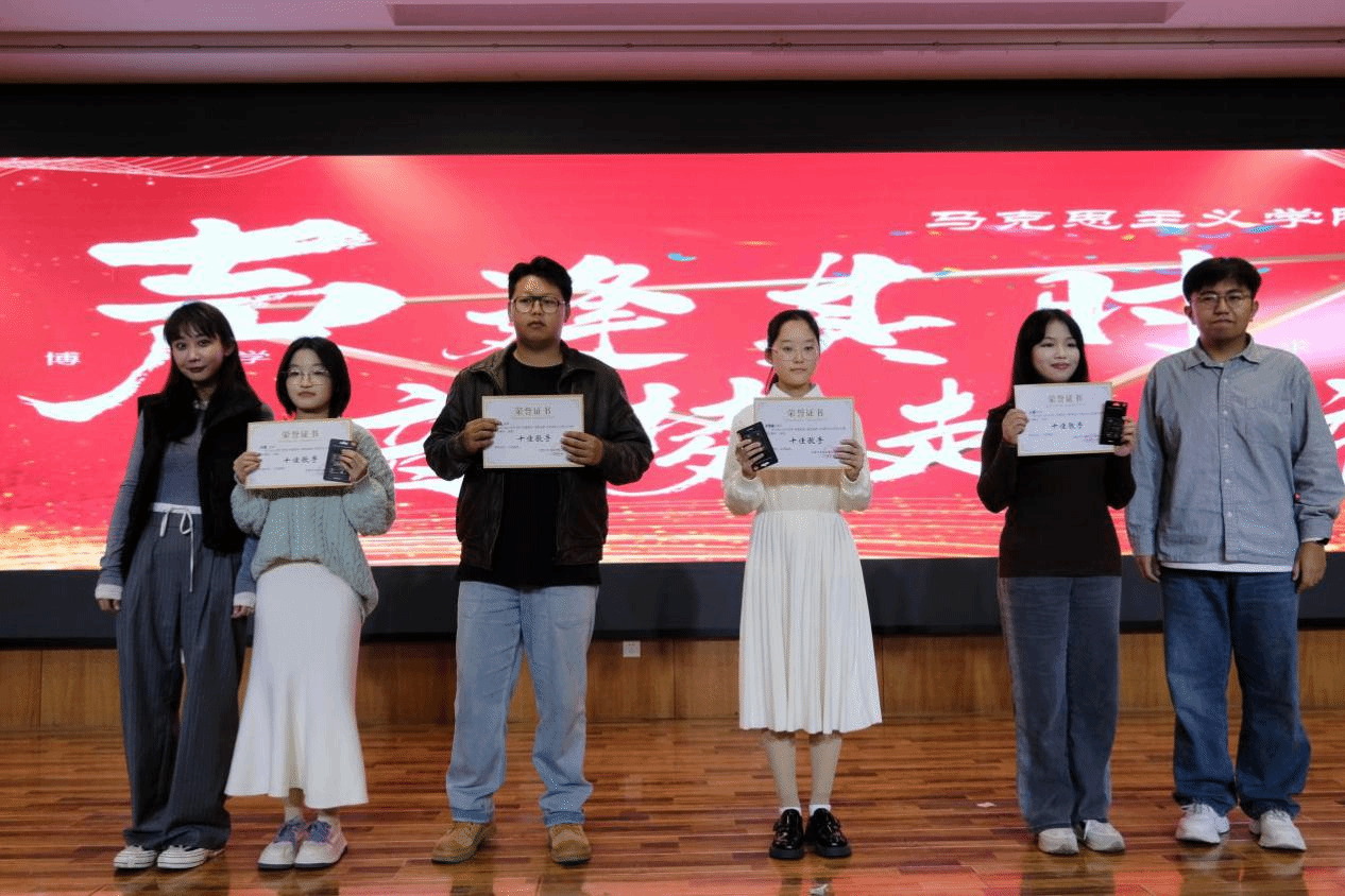 经过决赛的比拼,杨程涵,万晓帆和彭坤组合荣获一等奖,王琨、张啸铖、毕慧鑫和胡馨同学获得二等奖,孙可、郭天旭、吕启睿和梁小婵获得三等奖,领导老师们为获奖同学颁发获奖证书。