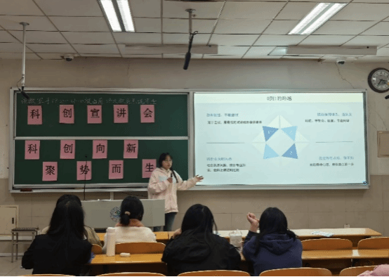 在宣讲过程中,于晴结合自身丰富的科创经历,对“挑战杯”“创青春”等重要科创赛事展开剖析,鼓励人文社科专业学生积极参赛。相茂雅围绕校创项目的选题、推进与撰写分享经验,强调选题需兼具独特性和可行性,并提供了从时事热点中挖掘选题的实用方法。蔡甜圆以个人参赛经历为线索,着重阐述选题的创新与聚焦要点,系统讲解社会科学论文写作规范,提出耐心积累、提前规划等建议,激励同学们踊跃投身科创实践。