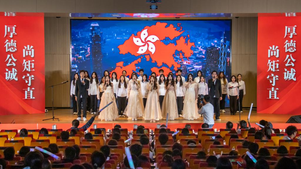 学子在嘹亮歌声中宣告:回归,寓意紫荆花盛开的方向;统一,是中华民族永恒的追求。建设新时代,你我同在。