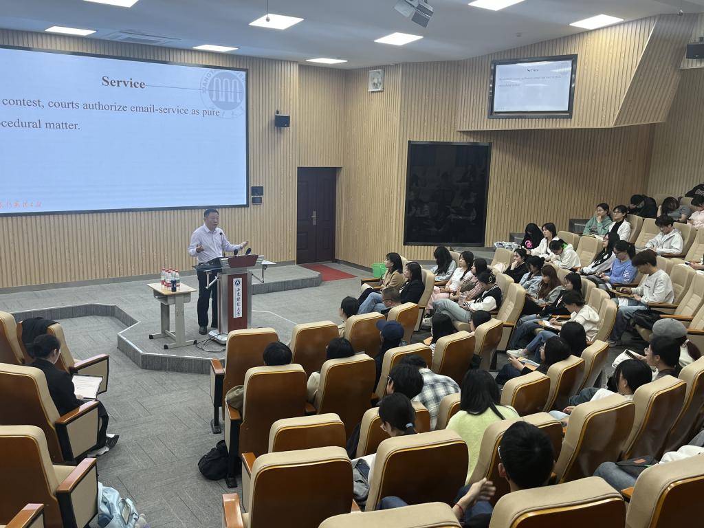 在讲座期间,覃斌武教授以幽默风趣的讲话风格和生动形象的类比举例,向在座师生剖析了中、美两国民事诉讼程序法的不同,以近年来美国法院对于我国跨境电商行使域外管辖权的案例为主旨,以其自身经办的案件为切入口,分析了此类案件数量激增的原因、讲解了法律争议焦点、提出了破解方案。覃斌武勉励在座同学,要常怀爱国之心,将法律人的职业追求同家国大义相结合,开阔眼界看世界。之后,覃斌武还为在场的同学剖析了刚刚举办的第十二届国际刑事法院模拟法庭比赛赛题,并为澳门娱乐