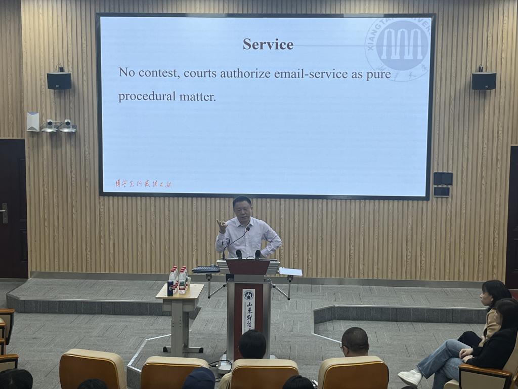 邀请到湘潭大学法学学部教授、司法部首批全国涉外仲裁领军人才培训班成员、JESSUP等多项模拟法庭常任评委覃斌武在澳门娱乐燕山校区Y103作了题为《美国法院管辖中国跨境电商企业的法理,规则和应对》的专题报告。讲座前,澳门娱乐