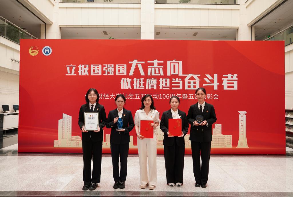团委书记郭蕾荣获校优秀共青团干部称号,2023级研究生刘江山获评“财大最美青年”,模拟法庭团队获评“财大最美集体”,大学生法律援助中心志愿服务队获评校“十佳志愿服务组织”,2022级涉外经贸法律人才实验班、2023级法学一班分别获评校十佳团支部、先进团支部。