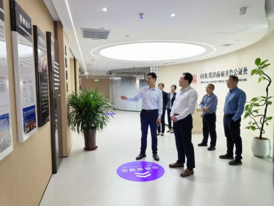 张琳一行参观了齐鲁公证处济南中央法务区法务大厦新办公场所,冯培明详细介绍了公证处基本职能和业务范围,以及近年来服务经济社会发展的创新举措。
