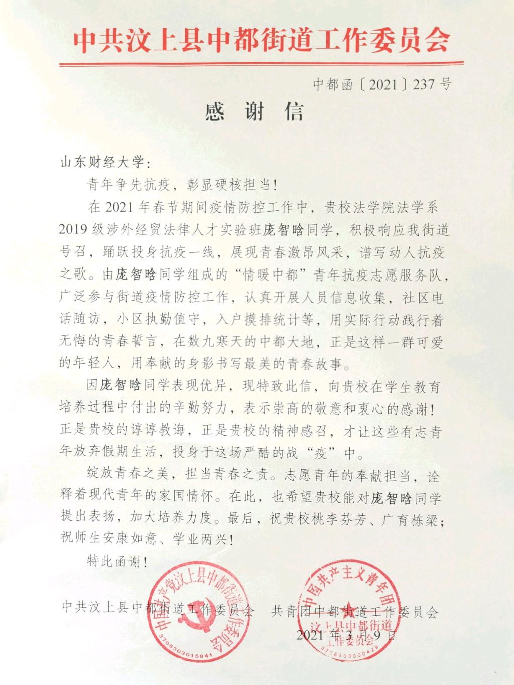 收到来自中共汶上县中都街道工作委员会的一封感谢信,对疫情期间奋斗在一线的抗疫青年志愿者庞智晗同学进行了表扬,对其在抗击疫情的紧要关头,积极响应号召,主动投身疫情防疫一线,充分发扬志愿服务精神及认真负责的工作态度给予了高度肯定,同时对澳门娱乐